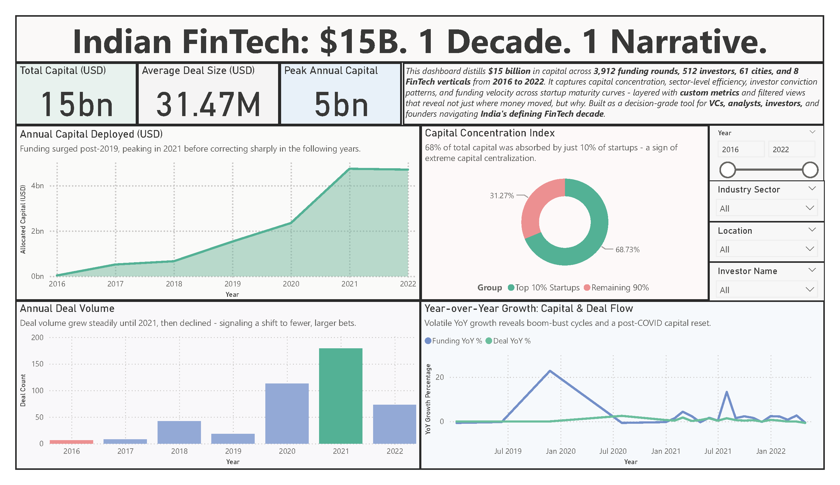 This dashboard is more than a visualization; it is a decision-making engine for the Indian FinTech ecosystem, providing clarity on investor behavior, capital flows, sector efficiency, and high-value opportunities. It condenses complex multi-year data into digestible, actionable insights, making it an essential tool for analysts, investors, and founders.